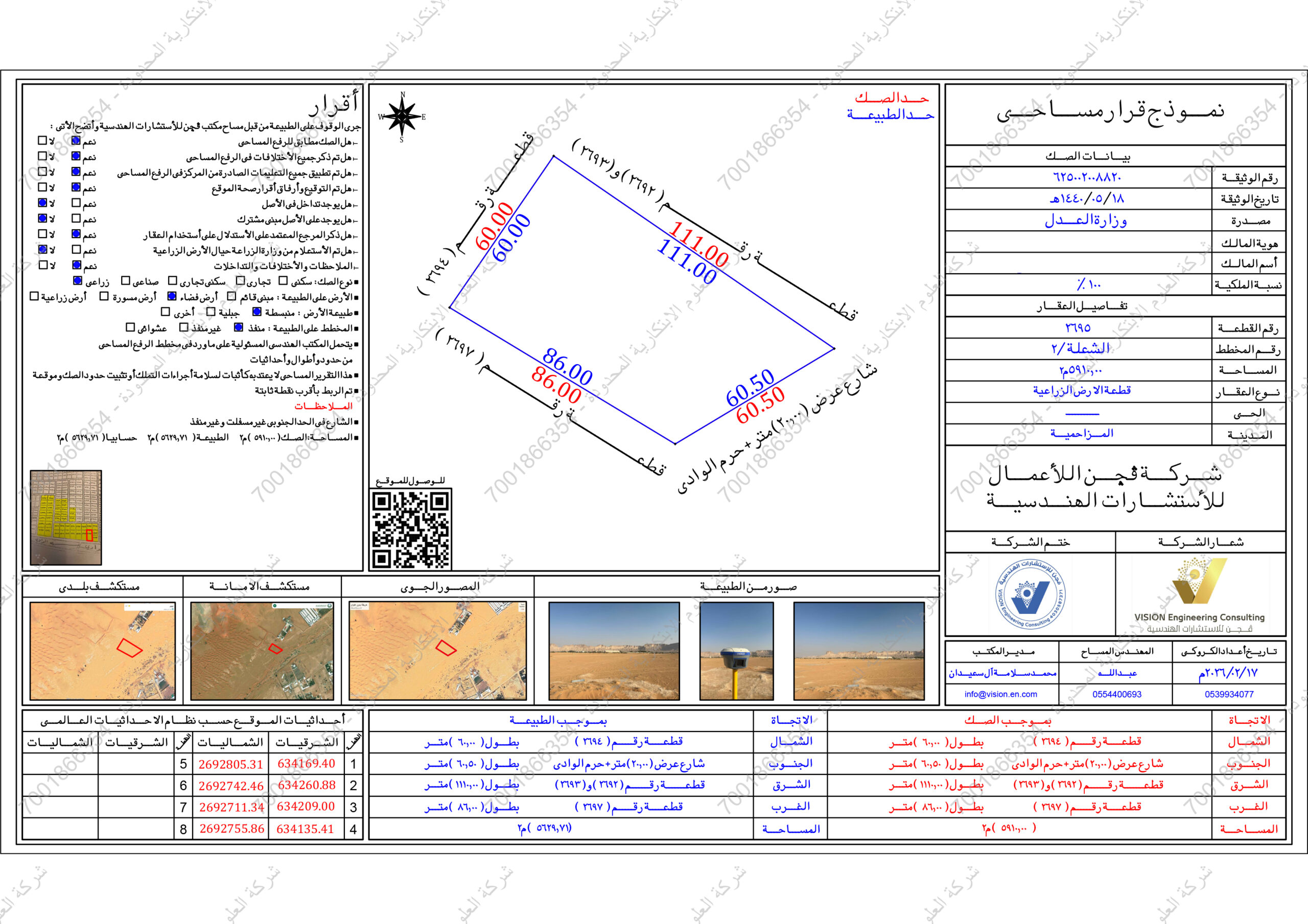 العقار عبارة عن أرض زراعية فضاء ملاحظات على العقار اختلاف في المساحة (الصك: 5910 م²، الرفع المساحي: 5629.71 م²) أهم المعالم القريبة مجموعة مزارع خاصة، مجموعة استراحات، مخيم وادي الحنية