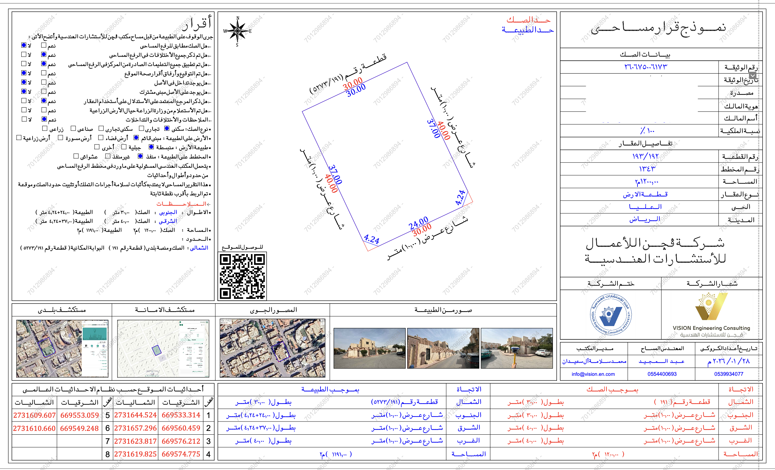 وصف العقار: العقار عبارة عن فيلا سكنية تتميز بوجودها على ثلاثة شوارع بواجهات جنوبية شرقية غربية بحي العليا مكونة من قبو ودور أرضي ودور أول وملحق أرضي. - القبو مكون من صالة وصالة طعام وغرفة نوم ومطبخ ومستودع ودورة مياه. - الملحق الأرضي مكون من غرفة حارس ودورة خرسانية + (مطبخ بسقف قماش وغرفتين خادمة وغرفة غسيل بسقف شينكو ( 55 م ) لم يتم احتسابهم). - الدور أرضي مكون من صالة وصالة طعام ومكتب وغرفة نوم ومطبخ و 3 دورات مياه. - الدور الأول مكون من صالتين و 4 غرف نوم ومطبخ و 3 دورات مياه. الملاحظات: العقار مؤجر. توجد اختلافات بين الصك والطبيعة في البيانات المساحية للعقار وهي مبينة في الرفع المساحي المرفق. يوجد اختلاف بمساحة الأرض بين الصك والبوابة، مساحة الصك 1200 م2 - البوابة 1199.97 م2. تم اعتماد مساحة الصك. يوجد اختلاف بالحدود بين الصك والبوابة، الصك قطعة رقم 191 - البوابة قطعة رقم 191 / 5273 - مستكشف بلدي قطعة رقم 191. أقرب المعالم: بانوراما مول 1.1 كم، أبراج الرياض 1.5 كم، محطة مترو بنك البلاد 1.5 كم