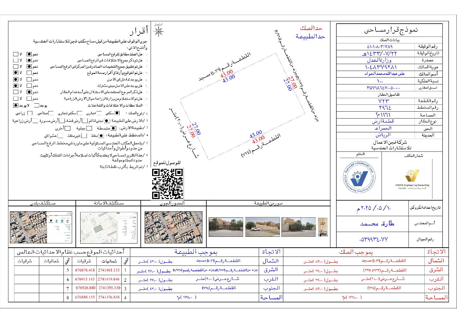 توجد اختلافات بين الصك والطبيعه في البيانات المساحية للعقار وهي مبينه في الرفع المساحي المرفق البيع يشمل المنقولات المعالم المجاورة بالقرب من طريق خالد بن الوليد ، وطريق الإمام عبدالله بن سعود
